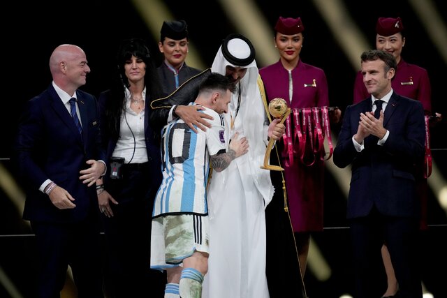 امیر قطر، قبل از اهدای جام به لیونل مسی، عبای سنتی قطریها را روی دوش انداخت.